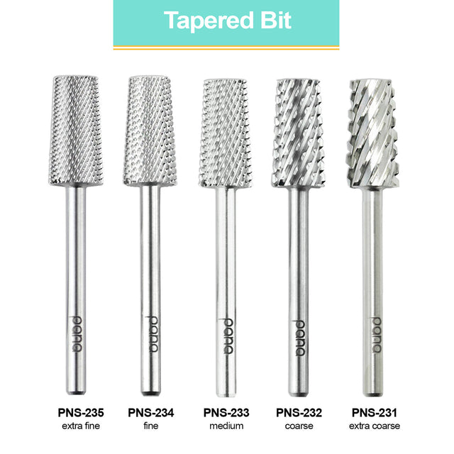 The PANA tapered drill bit includes are made with two different materials: tungsten carbide and ceramic coated drill bit. The tapered edge of the drill bit includes a finer grit at the tip of the bit to avoid any damages on the cuticle and surrounding nail wall and a coarser grit towards the base of the bit for general surface work such as backfilling, filing, smoothing, and shaping. The drill bits fits 3/32" shank and have 5 different grit sizes available (ranging from extra fine to extra coarse). This drill bit is suitable for nail techs who are working on artificial nails, the drill bit has many uses: from shaping, carving, smoothing, backfilling, and removing gel.